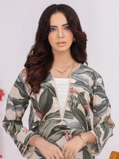 2pc Olive Green & off White shirt paired with off white printed trouser