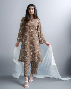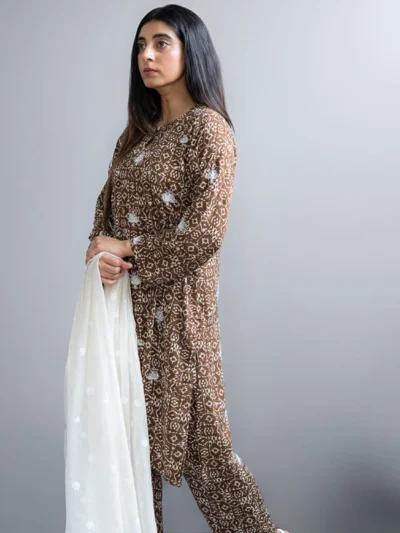 3 Piece Brown Stone Linen Embroidered Set with Fancy Neck